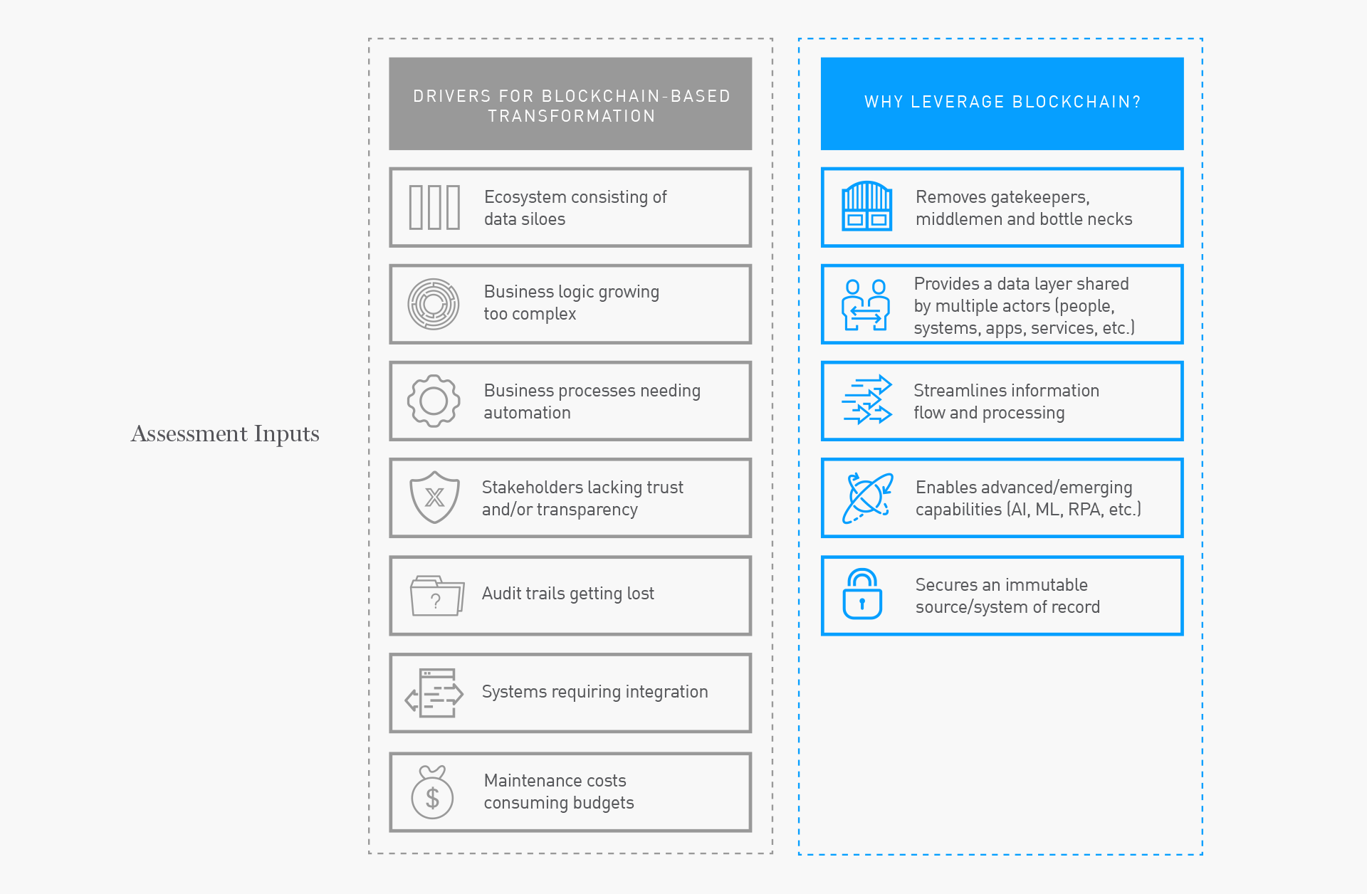 When considering the many elements of an individual’s identity–from name, age and address to employer, credit score and family members–it is easy to understand the importance of allowing individuals to have complete control over which elements are shared, who they’re shared with and for how long. The government plays several roles in managing a citizen’s identity, from issuing and maintaining, to validating and serving as the source of authoritative truth. The government processes and systems that maintain and secure the information are highly fragmented and costly. In addition, citizens bear the risk and potentially enormous consequences of data mismanagement. By using a distributed ledger to provide a highly secure, self-sovereign digital identity for each citizen, the government’s maintenance burden would be greatly alleviated, enabling greater trust and control by citizens. With identity elements maintained by citizens and then validated through consensus, government could leverage blockchain as a source of truth for tendering and tracking additional citizen services.